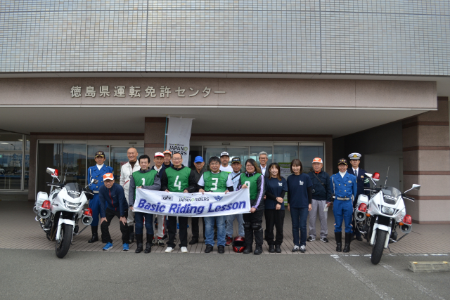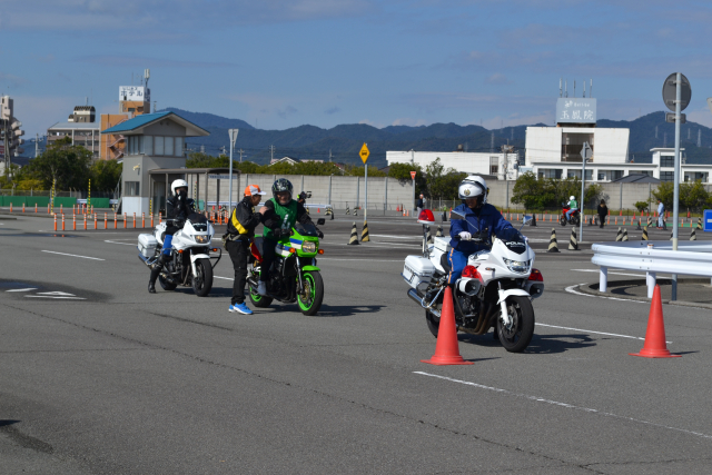 開講式では、徳島県の交通機動隊隊長補佐の方より徳島県内の交通事故状況及び運転時のかもしれない運転の徹底等の講話をしていただき、その後指導員リーダーより本日のスケジュール等を説明いただき講習に入り、講師は14名(徳島県交通機動隊の白バイ隊員4名、指導員10名)で、参加者が4名と少人数だったこともあり、受講者一人に白バイ隊員がマンツーマン、指導員が2名つき内容の濃い指導となりました。