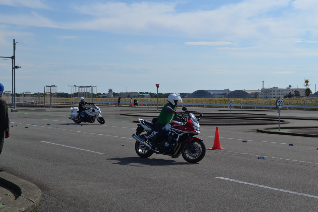実技では基本乗車姿勢、車両点検を行った後に各セクション(急ブレーキ、パイロンスラローム、定常円旋回、一本橋/遅乗り)別れ、都度指導を受けながら技術の向上に努め、最後に交通機動隊の方より、右直事故について実演を含め講話いただき終了となりました。