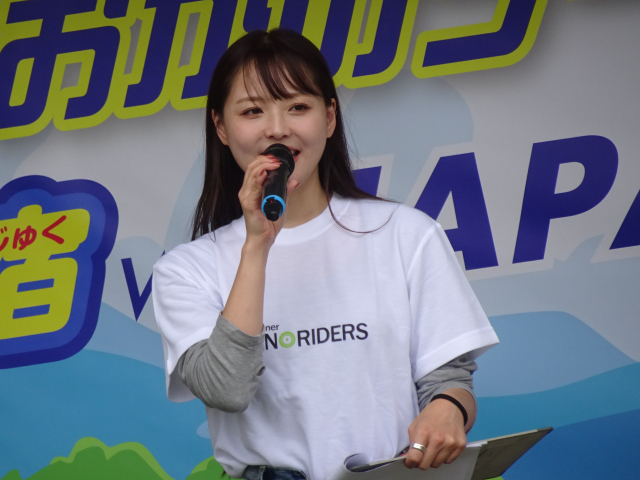 ジャパンライダーズブースでは、ジャパンライダーズ宣言をしていただいた方にノベルティを配布し、ゲストの坂元さんにもご協力いただき対応を行いました。また、ジャパンライダーズPRステージでは、坂元さんが日本二普協の活動紹介や二輪車の魅力、安全運転の大切さについて来場者へ向けて発信しました。