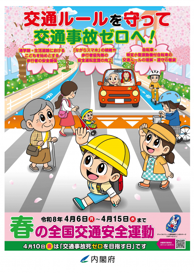 令和7年「春の全国交通安全運動」が、4月6日(月)から15日(水)まで実施されます!また、4月10日(金)は交通事故死ゼロを目指す日です。本運動は、広く国民に交通安全思想の普及・浸透を図り、交通ルールの遵守と正しい交通マナーの実践を習慣付けるとともに、国民自身による道路交通環境の改善に向けた取組を推進することにより、交通事故防止の徹底を図ることを目的としています。