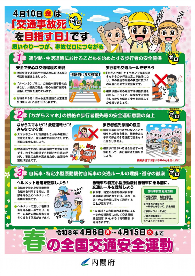 令和7年「春の全国交通安全運動」が、4月6日(月)から15日(水)まで実施されます!また、4月10日(金)は交通事故死ゼロを目指す日です。