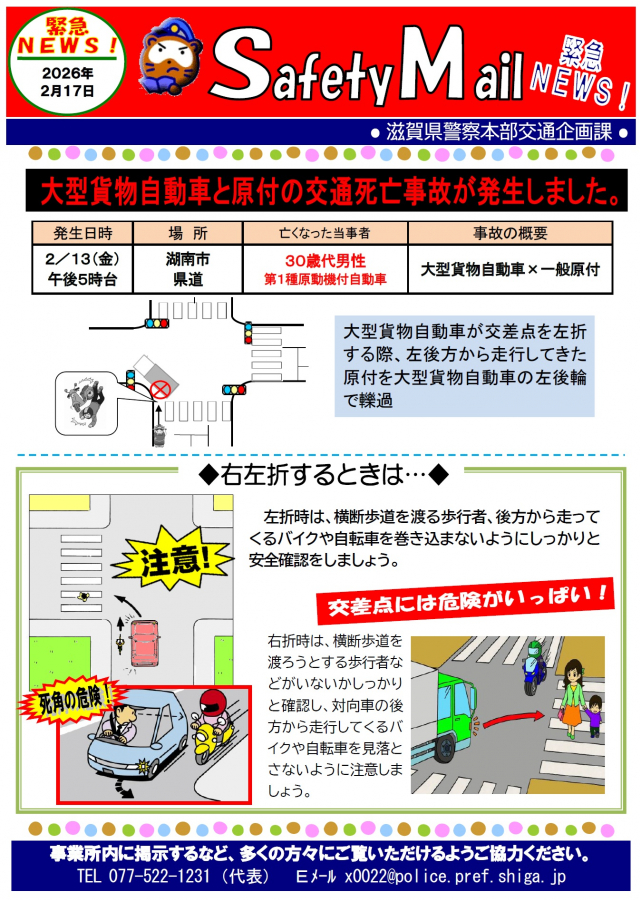 滋賀県 『緊急ニュース第01号(2026年2月17日)大型貨物自動車と原付の交通死亡事故発生!』リーフレットデータ