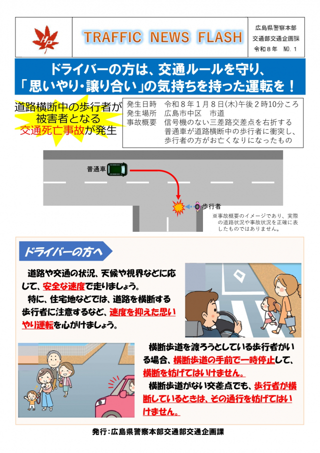道路横断中の歩行者が被害者となる交通死亡事故が発生‼