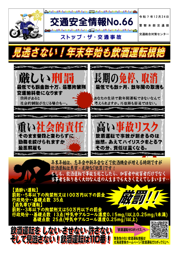 年末年始は忘新年会等で飲酒の機会が増える時期ですが、飲酒運転は、悪質・危険な犯罪です。二日酔いにも注意が必要です。前日のお酒が残ってしまった状態で運転しても当然、飲酒運転です!飲酒運転を根絶するためには、家族や飲食店での協力が不可欠です。公共交通機関の利用促進や、代行運転サービスを利用するなど、飲酒後の移動手段を確保しましょう。