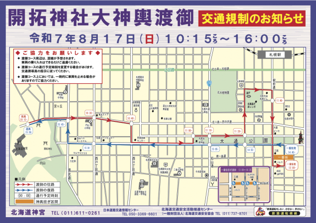 令和7年8月17日(日)午前10時15分ころから午後4時00分ころまで『開拓神社大神輿渡御』による交通規制が札幌幌市内で実施されます。特に大通や駅前通りといった中心部では車両通行が制限され、一時的な混雑が予想されます。交通規制MAP(PDF)>>>