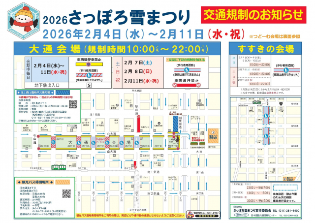 2026年2月4日(水)~2月11日(水・祝)開催の「2026さっぽろ雪まつり」では、各会場周辺にて一部交通規制が設けられます。会期中、会場近郊へお出かけされる方は規制区間のご確認をお願いします。