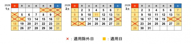 これからの休日割引適用除外日は…天皇誕生日を含む3連休(2月21日~23日)、春分の日を含む3連休(3月20日~22日)となっています。