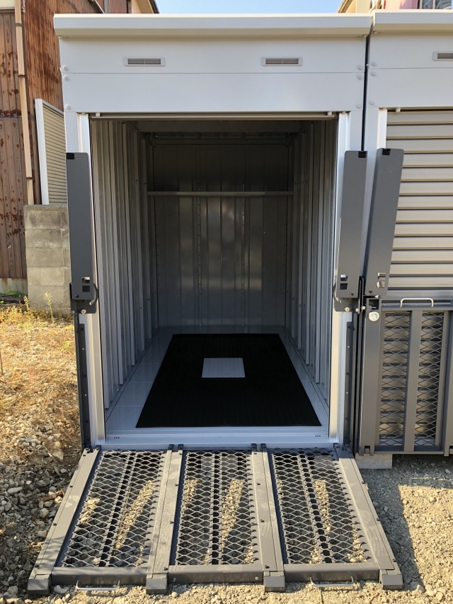 | 備考 | コンテナ式・スロープ付き・シャッター付き・バイクマット付き・鍵2つ付き・照明(常時・センサー・取外し可能)付き |
