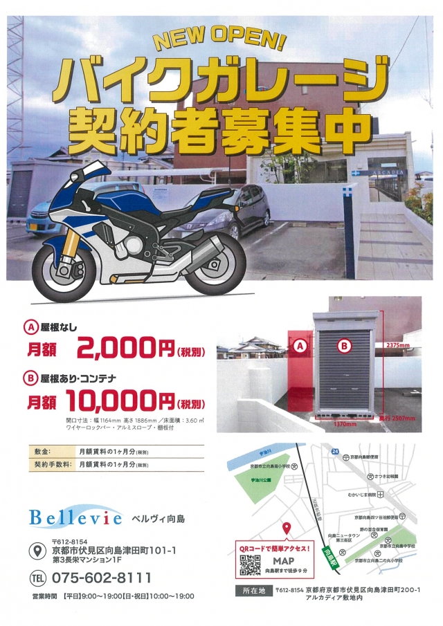 | 料金(月極) | 屋根なし:2,000円/1ヶ月 屋根あり・コンテナ:10,000円/1ヶ月 敷金:月額賃料の1ヶ月分 |